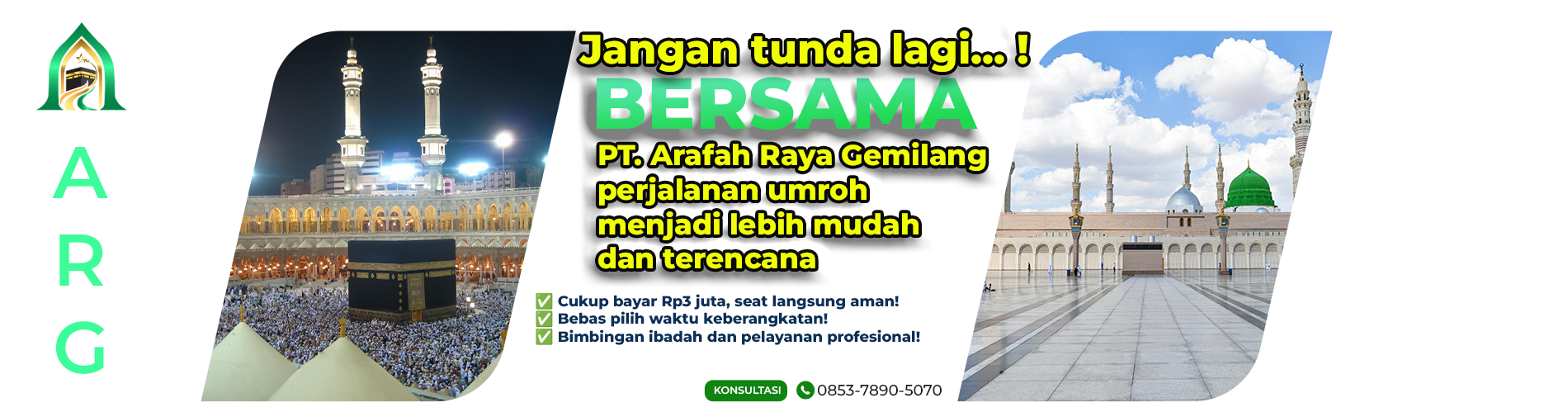 - Panggilan suci sudah tiba, jangan tunda lagi... Bersama PT. Arafah Raya Gemilang, perjalanan umroh menjadi lebih mudah dan terencana.